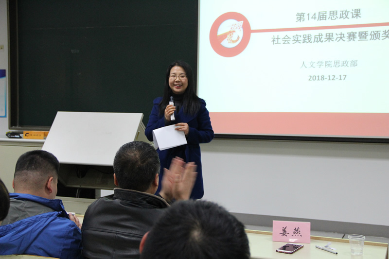 “道不可坐论,德不能空谈。”为带动同学们进一步深入学习贯彻党的十九大精神,切实感受我国改革开放40年所取得的伟大成就,向即将到来的我校第二次党代会献礼,12月17日晚18点,第14届思政课社会实践成果大赛决赛在9220教室举行。学工处处长夏斌、质控处处长肖海慧、团委副书记李凯、人文学院院长姜燕及党总支书记胡艳妹担任决赛评委,思政教师及部分学生代表观看了比赛。