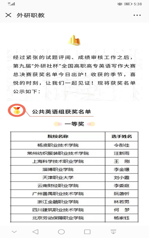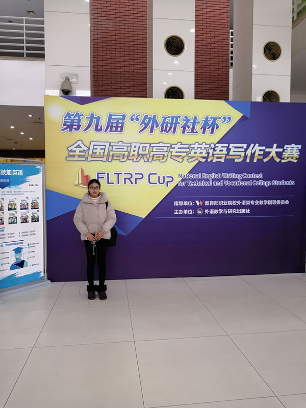 近日,由教育部职业院校外语类专业教学指导委员会指导、外语教学与研究出版社主办的第九届“外研社杯”全国高职高专英语写作大赛总决赛在北京顺利落下帷幕。我校汪新雨同学在来自全国28个赛区117名公共组选手中脱颖而出,以全国第二名的成绩荣获一等奖,刘云霞荣获优秀指导教师,这也是我校在这一赛事中取得的历史最好成绩。