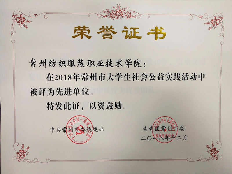 2018年6月,中共常州市委统战部、共青团常州市委员会下发《关于开展2018年常州市大学生社会公益实践活动的通知》,我校共组建14支实践团队深入基层、贴近群众,如火如荼地开展了精神宣讲类、环保宣传类、母亲河保护类、国情社情观察类、关爱弱势群体类、民族文化宣传类等社会公益活动,充分展示了我校学子热衷公益的良好思想道德素质,并在社会上取得良好反响。