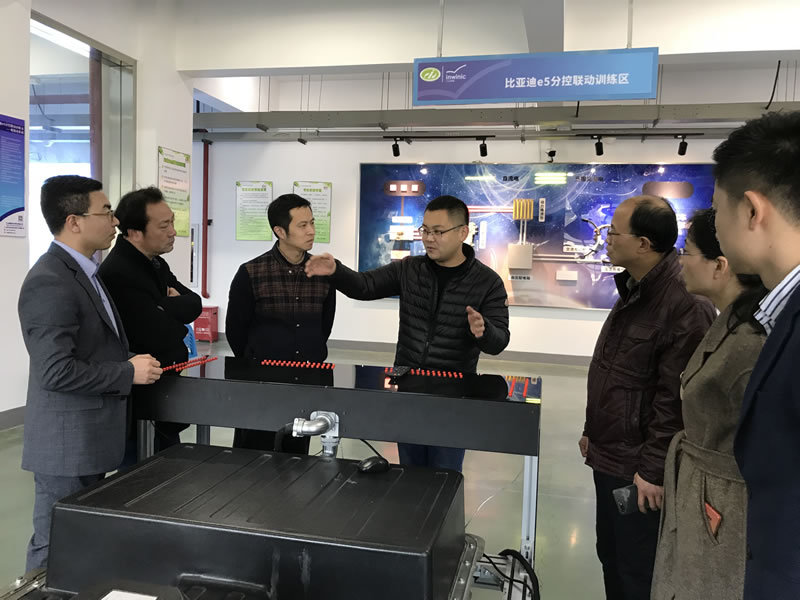 在调研过程中,专业团队参观了新能源汽车电工电子与高压安全实训室、比亚迪e5分控联动训练台的电驱动系统、车身电气系统和电动空调系统实训室,充电管理系统实训室等,听取了该校骨干教师金传琦相关详细介绍,使我校一行人员对新能源企业实训条件形成了系统的认识。