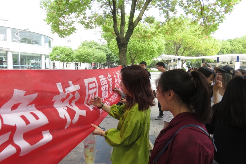本次活动主要有两个主题“拒绝校园霸凌”和“打击套路贷”,民警给同学们剖析了“校园霸凌”和“套路贷”的案例,讲解了遭遇到“校园霸凌”和“套路贷”时的正确处理方法。最后,大家在“拒绝校园霸凌,共创和谐校园”和“严厉打击套路贷黑恶势力违法犯罪”的横幅上郑重签名,表达了自己对扫除黑恶势力的决心和信念。