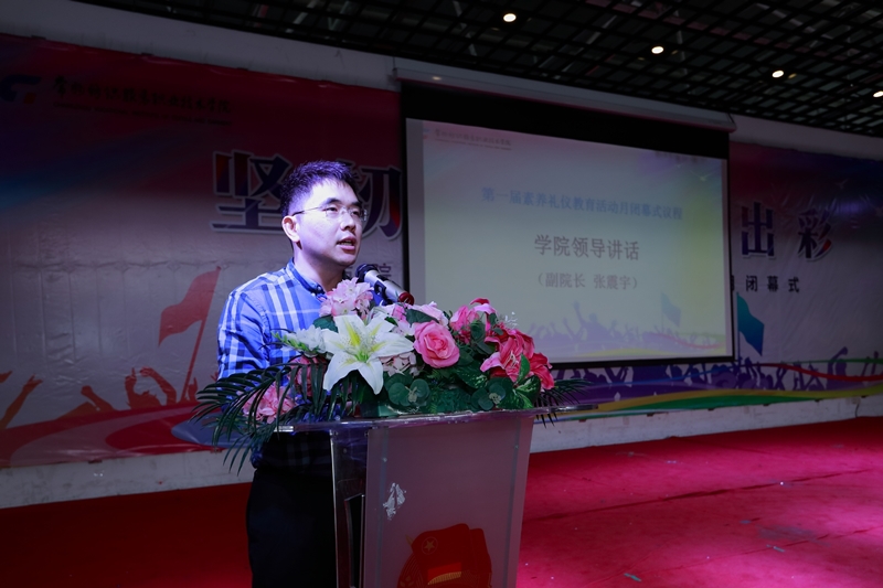 张震宇对本次活动月各项活动给予了肯定,对受表彰的集体和个人表示了祝贺,他希望同学们能以本次素养礼仪教育活动月为契机,用先进文化武装自己,多参加丰富多彩、积极向上的文体活动;讲文明懂礼仪,用文明语,行文明事,做文明人;关注心理健康,注重自我建设;珍惜在校的学习机会,全身心地投入到学习中去,学有所长,学以致用,回报社会。