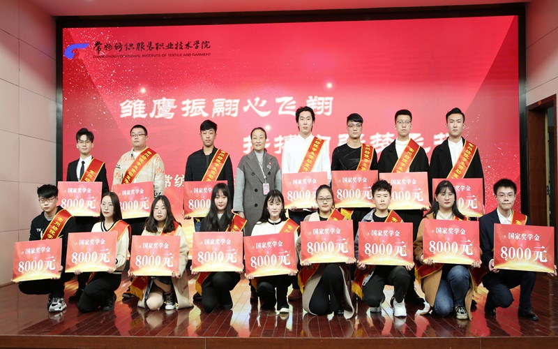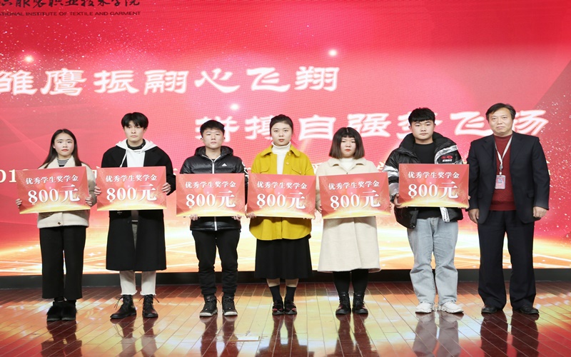 在学生表彰仪式环节,团委副书记朱鹏宣读了《2019年度常纺院国家奖学金、国家励志奖学金、省级三好学生、优秀学生干部、先进集体、校优秀学生奖学金以及文明班级的表彰决定》;副院长张震宇、组织部部长高江荣、宣传部部长夏斌、人事处处长赵振勇、保卫处处长罗卫东、校企合作处副处长蒋云松、招就处副处长顾加强分别为获得各级奖助学金及荣誉称号的学生代表颁发荣誉证书。党委书记蒋心亚为国家奖学金获得者颁奖并佩戴“学生资助宣传大使”绶带。国贸1731班邱有煊同学代表国家奖学金获奖者发言,他表达了对学校及老师的衷心感谢,分享了两年多的学习成长经验,并表示将坚定理想信念,努力充实提高自身,为学校发展争光添彩。