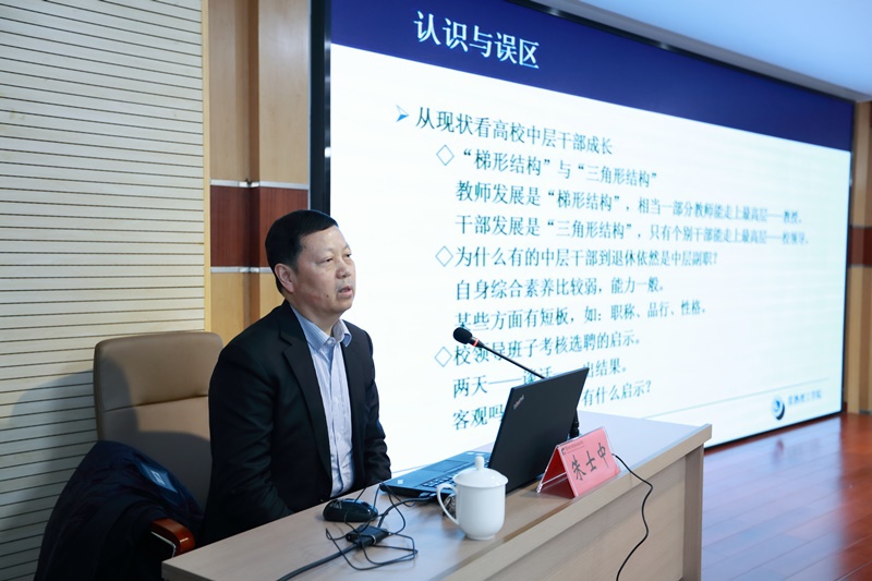 朱士中的讲座题目为《高校中层干部工作方法与能力提升》。他结合自身工作经历,从认识与误区、角色与定位、责任与担当、理念与创新、能力与素养、沟通与效率、表达与形象等七个方面科学系统地讲述了高校中层干部在实际工作中经常遇到的问题,并提出了富有建设性、针对性和可操作性的意见和建议。