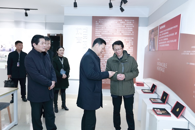 在洪霄院长等人的陪同下,朱士中参观了我校文化展示中心。