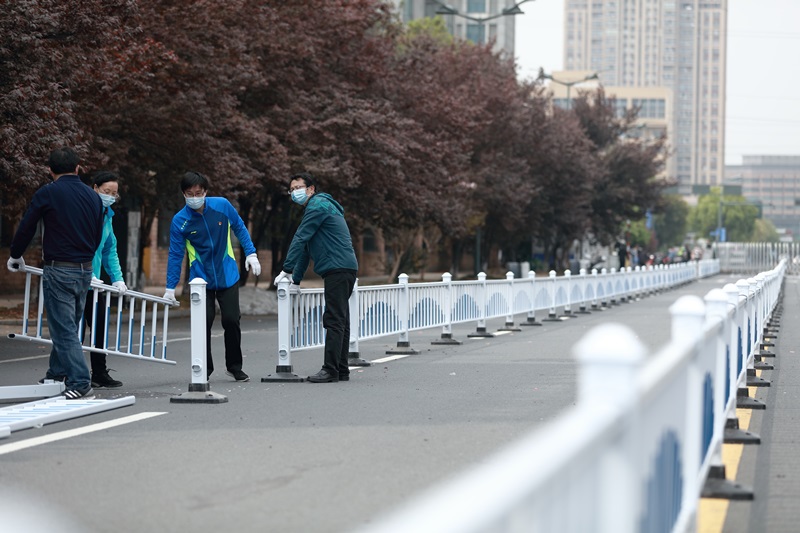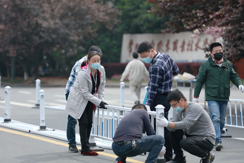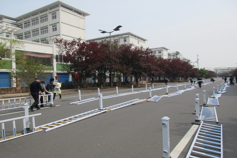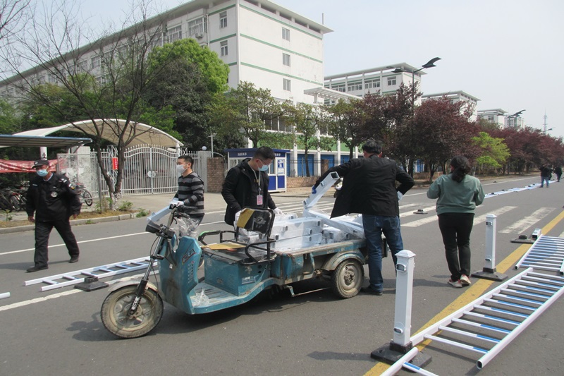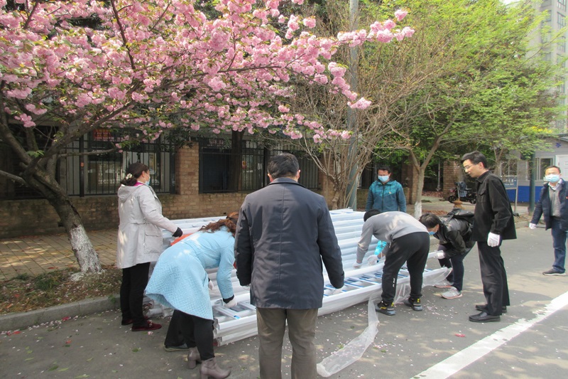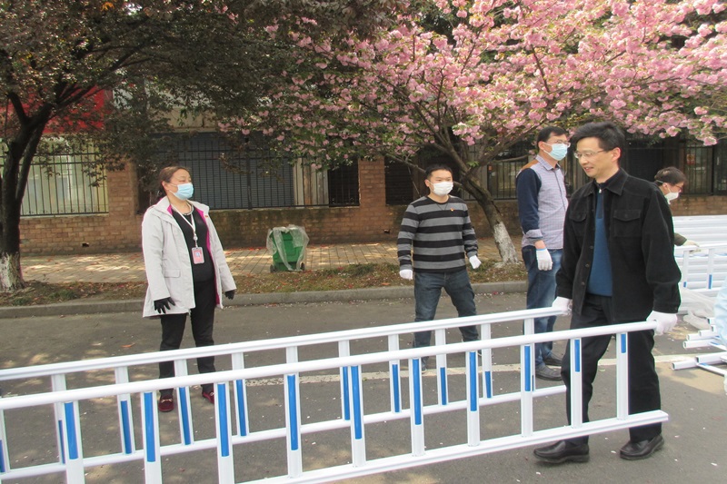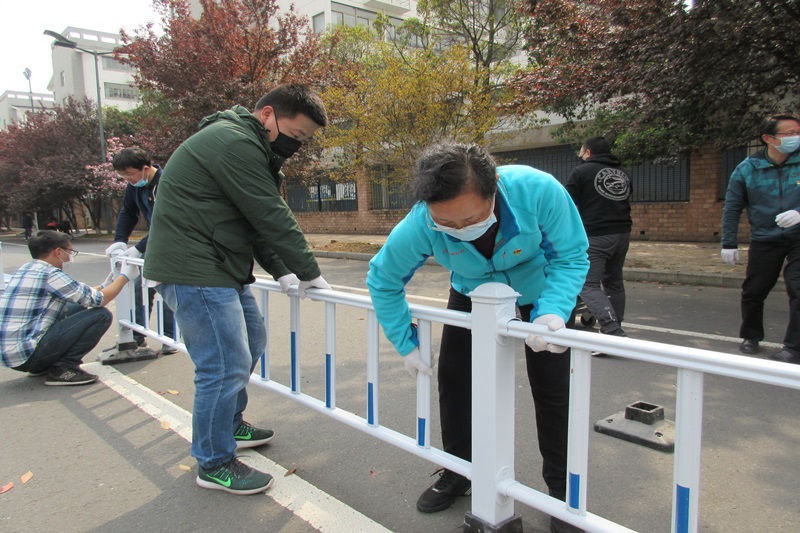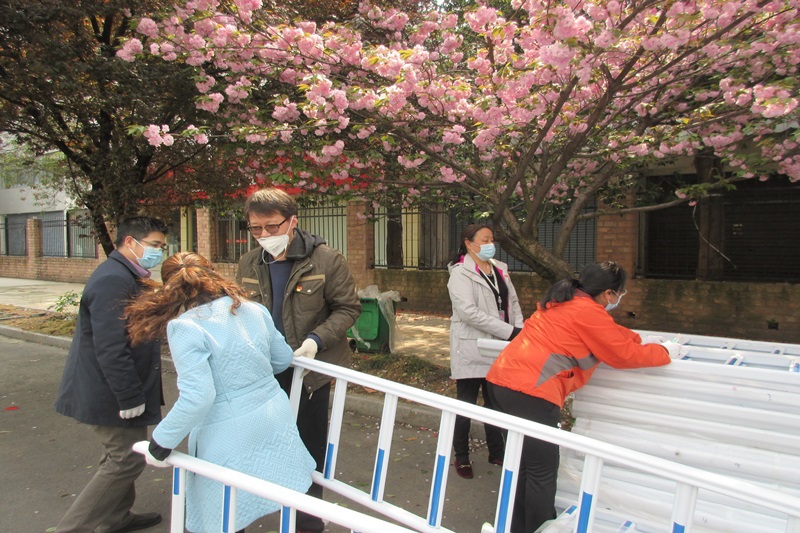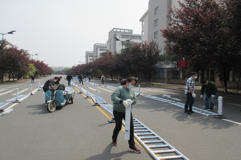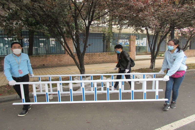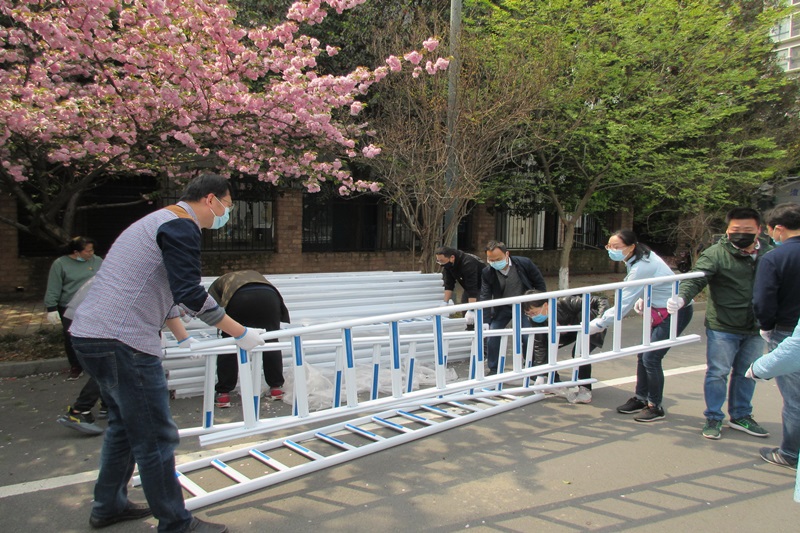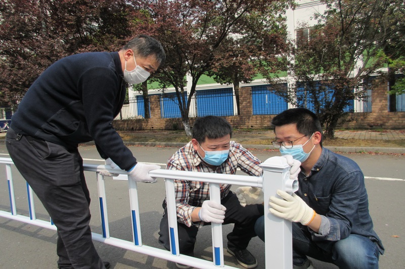 4月10日,机关党总支“抗疫”先锋队30余名同志在学校东门樱花路开展志愿服务活动。下午13:30,在相关职能部门同志介绍完学生入学通道隔离栏安装设置方案和安装方法后,先锋队队员迫不及待投入安装工作,大家分工明确,有的确定位置,有的组装防护栏,有的安装防护栏,工作现场井然有序,历时近2个小时完成了近千米入学通道隔离防护栏的安装,为疫情期间学生返校的良好秩序打下坚实的基础。