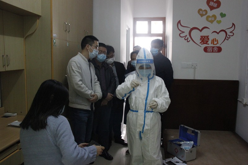 演练从一名学生在宿舍出现发热症状,立即报告班主任开始 — 二级学院党总支书记—校疫情防控领导小组办公室— 保健站站长 — 医生复测体温 — 校内外信息报告 — 分管院长指示 — 专车送第二人民医院阳湖院区就诊 — 临时警戒 — 消毒 — 最后发热学生诊断为普通感冒发热后返校入住青教公寓隔离医学观察区的全流程。