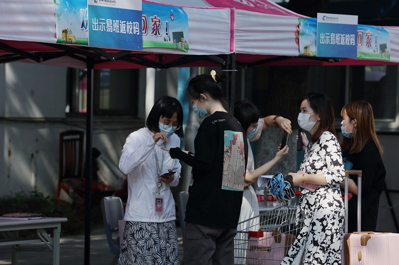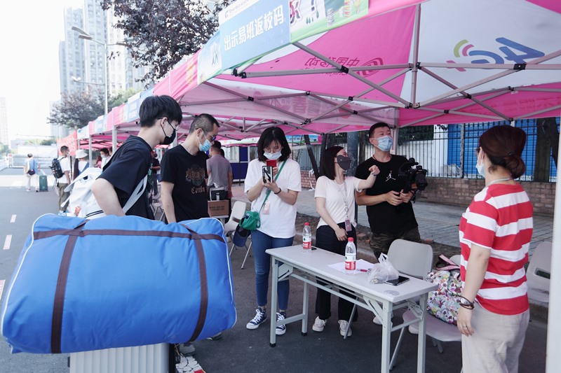 学校在前期充分摸排学生健康信息、返校信息,严格做到“定时、定点、定人、定方式”,精准服务每位学生。学生提前在易班平台上报个人健康码、行动轨迹、返校时间及方式,申请返校并生成“易班返校码”。报到现场,扫描“易班返校码”直接办理报到及入住,既方便快捷又精准核验,避免了人员的聚集。