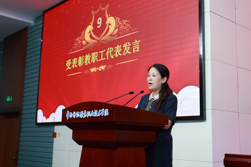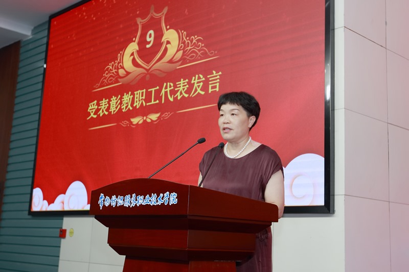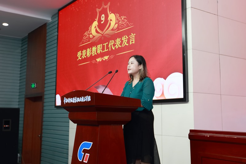 优秀教师代表刘娟发言要牢固树立“认真就是能力、扎实就是水平、求实就是业绩”的事业观,不断提高自己的业务素质和教学水平,与每一位学生共同进步。