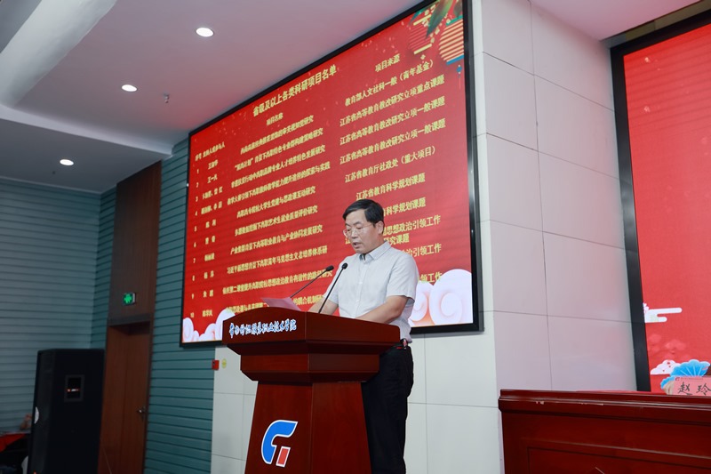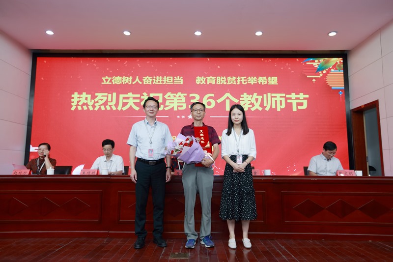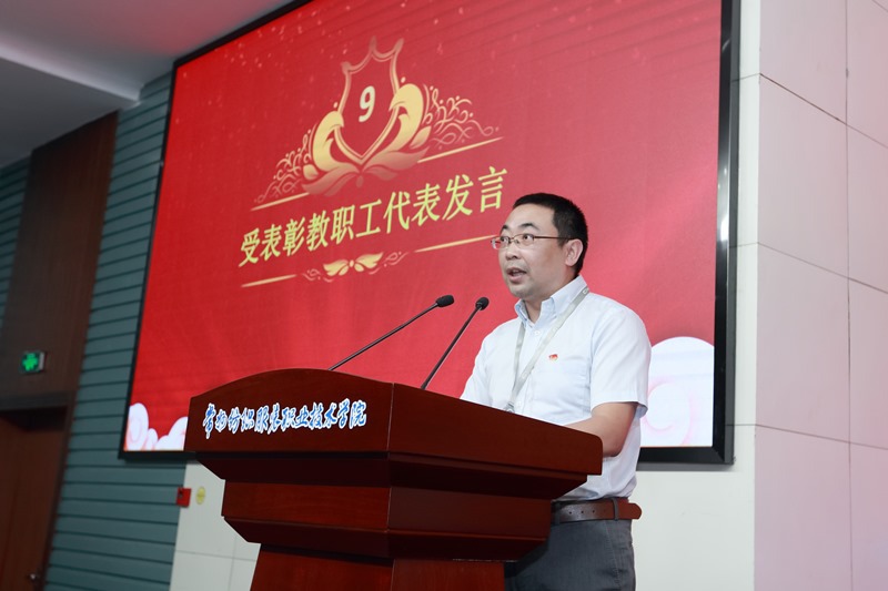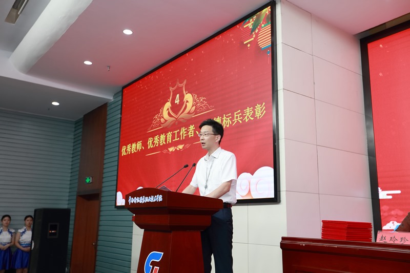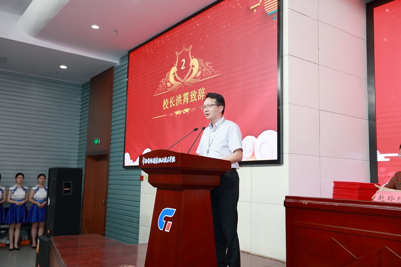 院长洪霄向大会致辞,并向全校教职工、离退休同志以及校友和教职工家属,致以亲切的问候和衷心的感谢!他指出教师是教育发展的第一资源,是立教之本,是兴教之源。今年春节以来,面对新冠肺炎疫情爆发的严峻形势,全校师生齐心协力,攻坚克难,共同努力,快速开展了线上教学,实现了“停课不停教、停课不停学”的目标,学校的各项工作有序推进。今年教育部确定教师节的主题是:立德树人奋进担当,教育脱贫托举希望。因此,他强调全校教职工要深入贯彻习近平新时代中国特色社会主义思想,始终牢记立德树人使命,自觉加强师德修养,全面提高业务能力,以德立身、以德立学、以德施教,做好学生锤炼品格、学习知识、创新思维、奉献祖国的引路人;要深入实施人才强校战略,全面深化人事制度改革,大力弘扬尊师重教的良好风尚,不断改善教师的工作、学习和生活条件,激励教师发展,关爱教师成长,提高教师待遇,维护教师权益,让广大教师有更多的获得感、荣誉感和归属感。最后,他希望广大教师践行“进德、立业、敏学、笃行”校训,弘扬“勤学、苦练、简朴、谦逊”校风,传承“乐教、严谨、求真、爱生”教风,坚持教书与育人相统一、言传与身教相统一、潜心问道与关注社会相统一、学术自由与学术规范相统一,努力成为有理想信念、有道德情操、有扎实学识、有仁爱之心的好老师。在落实立德树人根本任务中不断创造新业绩,为学校加快建设“特色鲜明、省内一流、国内知名”的高水平高职院校作出新的更大贡献。