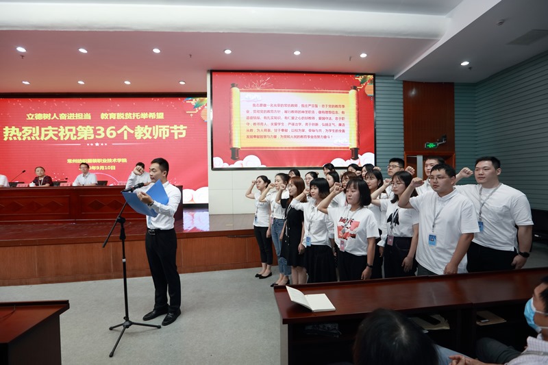 19名新教师在潘宜康老师的领誓下庄严承诺,志愿成为光荣的人民教师,忠诚党的教育事业,遵守教育法律法规,为教育发展和民族振兴努力奋斗。