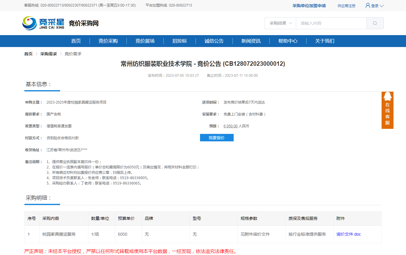 【采购公告】2023-2025年度校园家具搬运服务项目询价公告