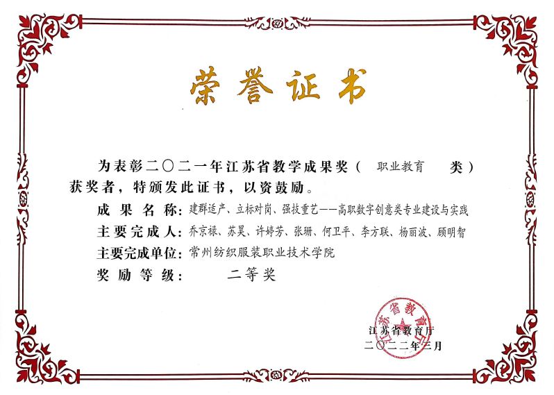 学院教育教学成果丰硕,获得职业教育江苏省教学成果奖二等奖1项;教师教学能力大赛二等奖3项,三等奖1项;由影视动画、视觉传达设计、环境艺术设计、广播影视节目制作四个专业组成的影视动画专业群2021年入选江苏省高水平专业群建设培育项目;作为牵头单位制定了影视动画、视觉传播设计与制作2个国家级专业教学标准;建成省部级基地6个:江苏省(创意设计“1+N”)产教深度融合实训平台;纺织服装数字创意公共技术(集成)平台;三维人体数据与数字艺术产品工程技术研究开发中心;江苏省高校哲学社会科学重点研究基地-江苏服饰文化研究院;教育部文化素质教指委“传统技艺传承示范基地”,江苏省职业教育美术类非物质文化遗产技艺技能传承创新平台。