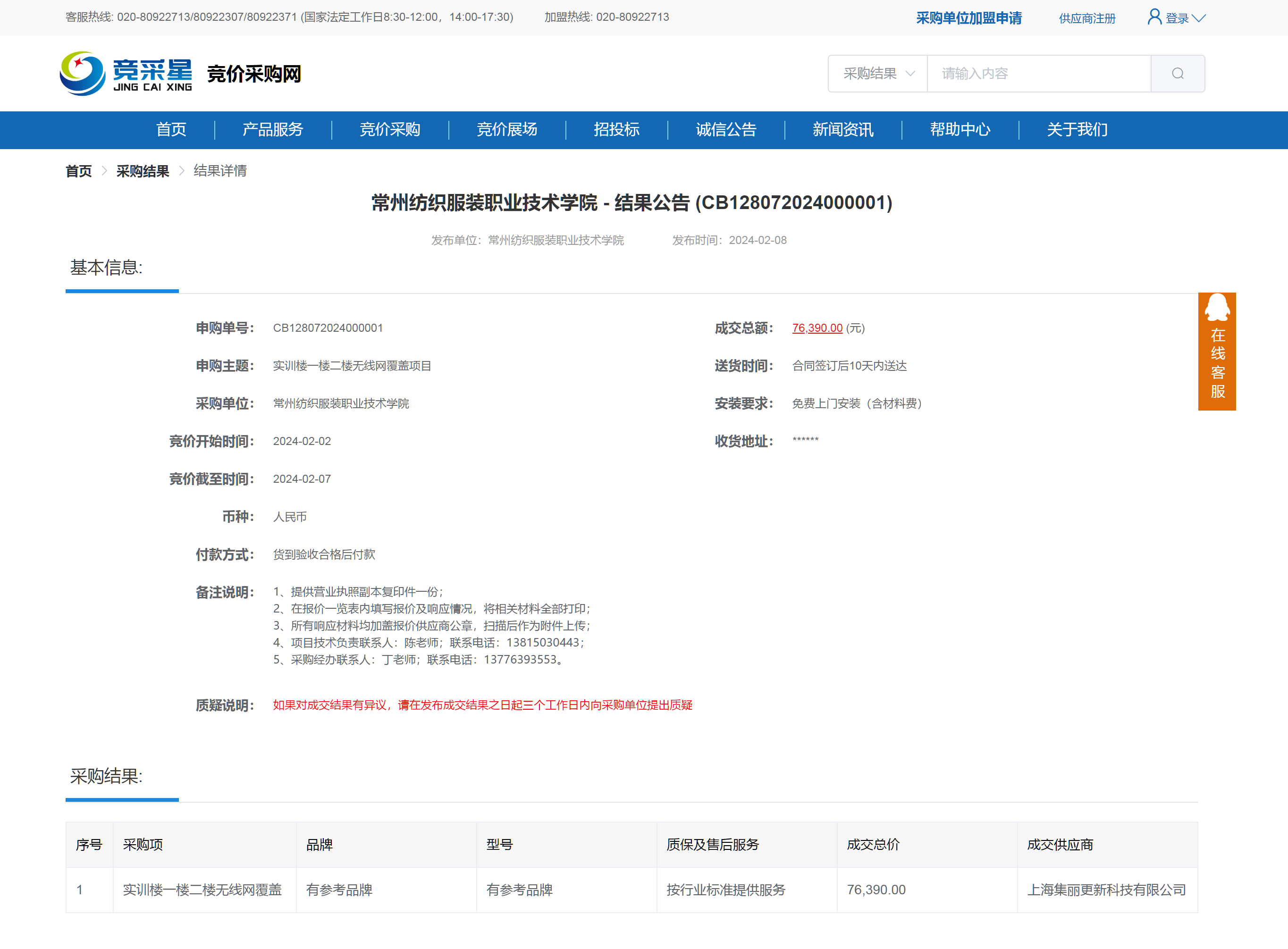 【成交公告】实训楼一楼二楼无线网覆盖项目成交公告