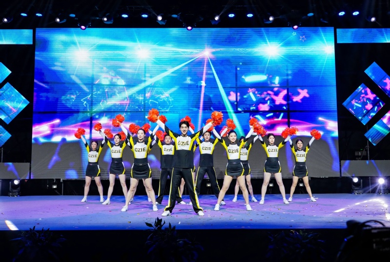 第三篇章“建功新时代”中,服装与设计学院与X-show模特社携手献上时装秀《一枝独秀》,展示了学生的创新思维与时尚触觉,为晚会增添了一抹独特的亮色。啦啦操校队的《第一梯队》生动展现出常纺青年的青春激情,燃爆全场。由庄佳蕾及大学生艺术团带来的歌伴舞《灯火里的中国》,以深情的歌声和舞姿,表达了对祖国的深情厚谊与美好祝愿,高亢的曲调响彻整个体育场上空,将整场晚会推向高潮。