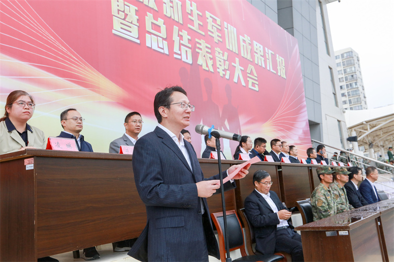 紧接着,大会进入了表彰环节。党委副书记、校长洪霄向承训部队赠送了锦旗,以表达学校对部队官兵辛勤付出的感激之情。马昀宣读了多项表彰决定,包括优秀教官、优秀政委、优秀参谋、优秀教导员、优秀学员、队列标兵、作风纪律标兵、内务标兵及优秀军训团等荣誉的获得者。在颁奖环节,党委副书记王顺明,党委委员、副校长张文明,党委委员、宣传部部长夏斌以及洪霄校长等领导分别为获奖者颁发了荣誉证书。这些荣誉的获得,不仅是对获奖者个人努力的肯定,更是对全体新生军训期间辛勤付出的认可。