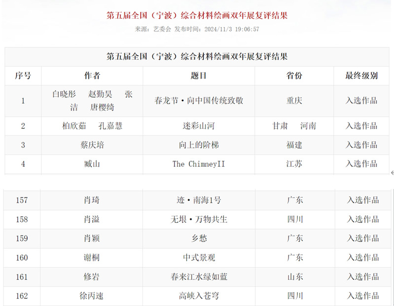 11月3日,中国美术家协会第五届全国(宁波)综合材料绘画双年展复评结果公示,我校服装与时尚设计学院肖颖教授作品《乡愁》成功入选。