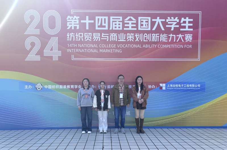 2024年11月1日至3日,第十四届全国大学生纺织贸易与商业策划创新能力大赛在盐城工业职业技术学院落下帷幕,智能纺织与材料学院邵东锋、杨静芳团队指导的学生团队凭借扎实的技能和过硬的个人素质,取得了优异成绩。