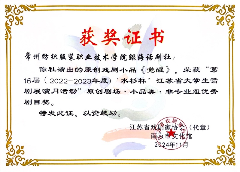 近日,第16届“水杉杯”江苏省大学生话剧展演月活动圆满落幕,由生·长思政工作室指导的鲲海话剧社凭借两部原创戏剧小品《觉醒》与《建党伟业》,在激烈的竞争中脱颖而出,均荣获原创剧场·小品类·非专业组优秀剧目奖。