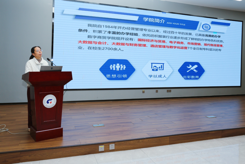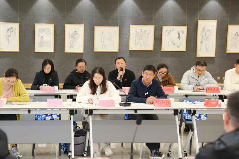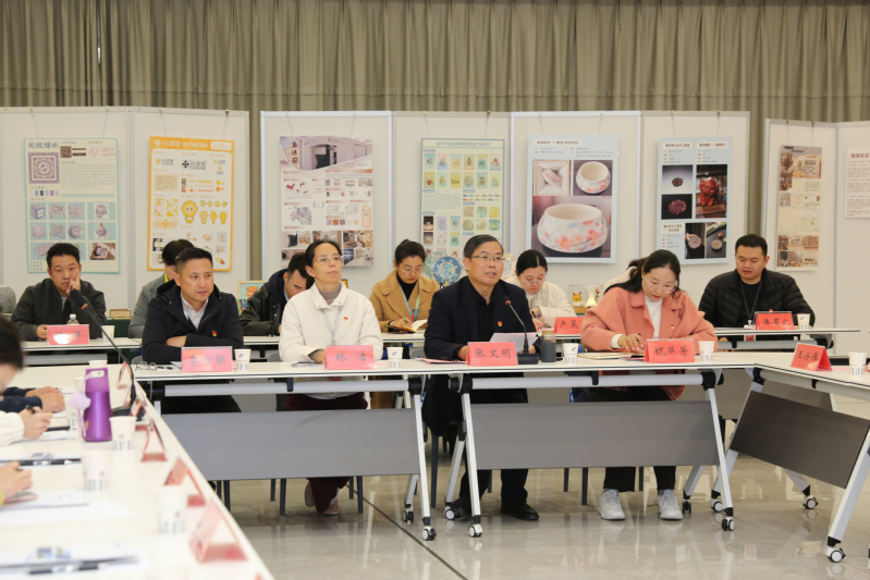 在参观了文化传承与创新中心以后,大家来到领秀展厅开展座谈交流。校党委委员、副校长张文明、校企合作处副处长王兴伟、科技处副处长苏昊、创意设计学院党总支书记祝燕芳、数字商贸学院党总支书记林洁、创意设计学院院长李方联、副院长武传奇、党支部书记、教师代表出席了座谈会。会议由创意设计学院党总支书记祝燕芳主持。