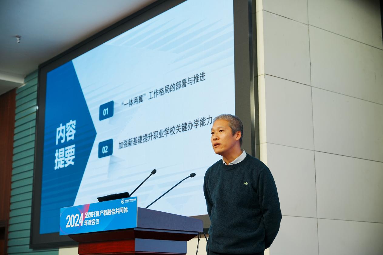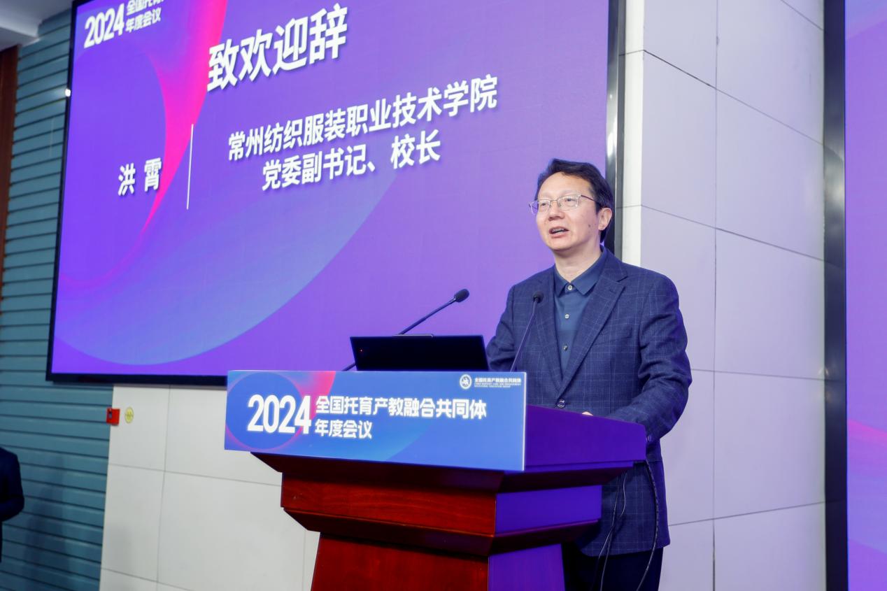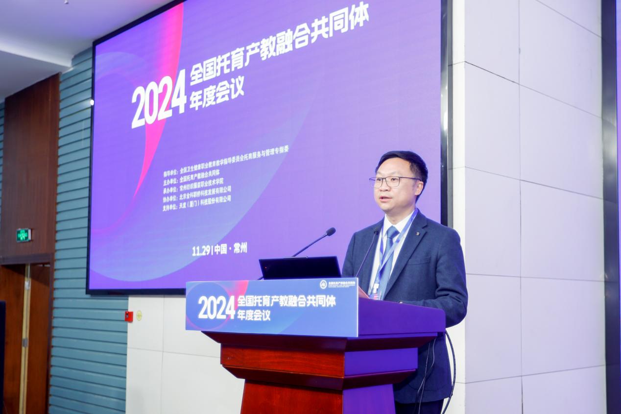 会上,洪霄致欢迎辞。他分享了学院立足自身优势,精准对接托育产业发展需求,积极探索托育人才培养的实践探索和系列成果。随后,他从人才培养、标准制订、“五金”建设及数字化转型等方面汇报了2024年度在推动托育产教融合方面取得的成就。