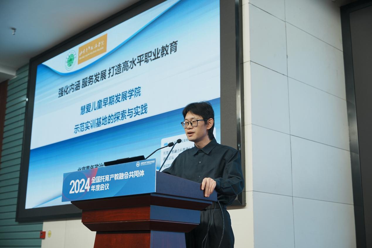 北京青年政治学院学前教育学院副院长张浩然作了题为《慧爱儿童早期发展学院示范实训基地的探索与实践》的报告,分享了学校校企合作建设托育产业学院的实践和成果。