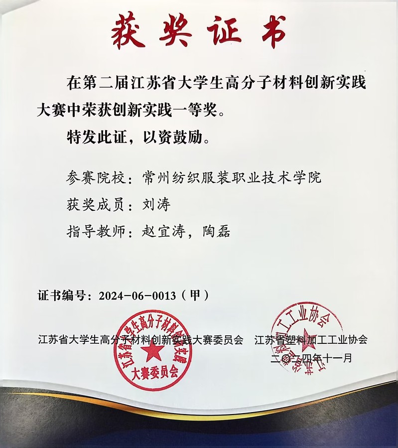 智能纺织与材料学院学子在第二届江苏省大学生高分子材料创新实践大赛中再获佳绩