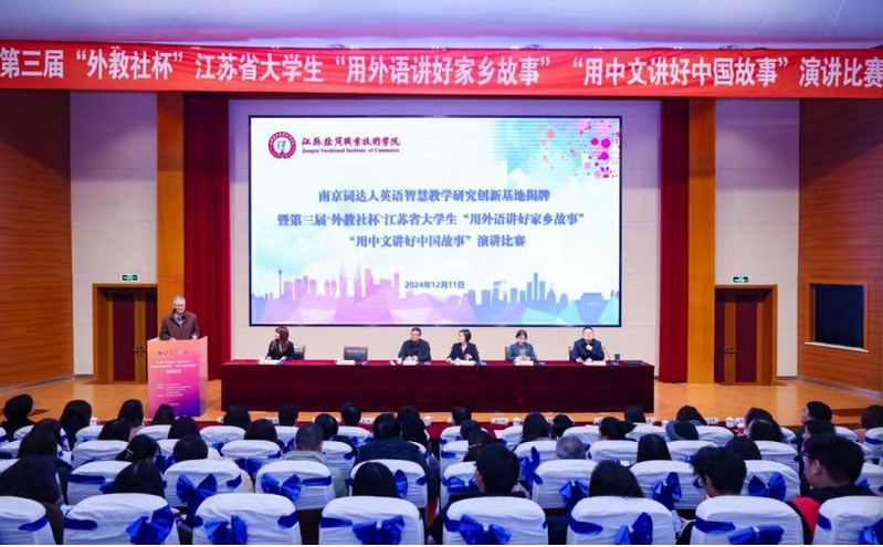 12月11日,由江苏省高等教育学会指导、江苏省高等学校外国语教学研究会、“学习强国”江苏学习平台、上海外语教育出版社主办,江苏经贸职业技术学院承办的第三届“外教社杯”江苏省大学生“用外语讲好家乡故事”“用中文讲好中国故事”演讲比赛决赛顺利举行。我校通识教育学部选送的凌云欣、徐学敏指导的幼服专业学生史妤婕的作品获得职业院校组特等奖。