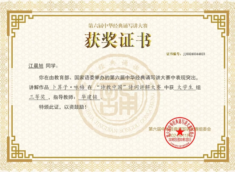 第六届中华经典诵写讲大赛诗词讲解大赛三等奖证书