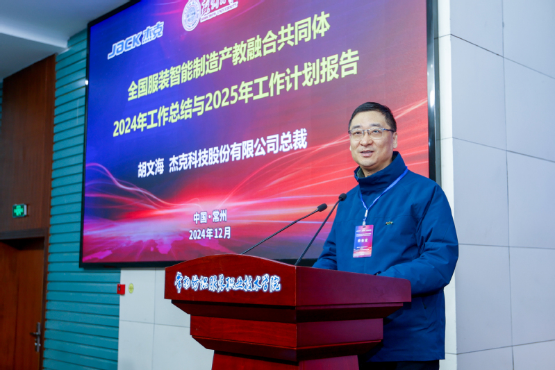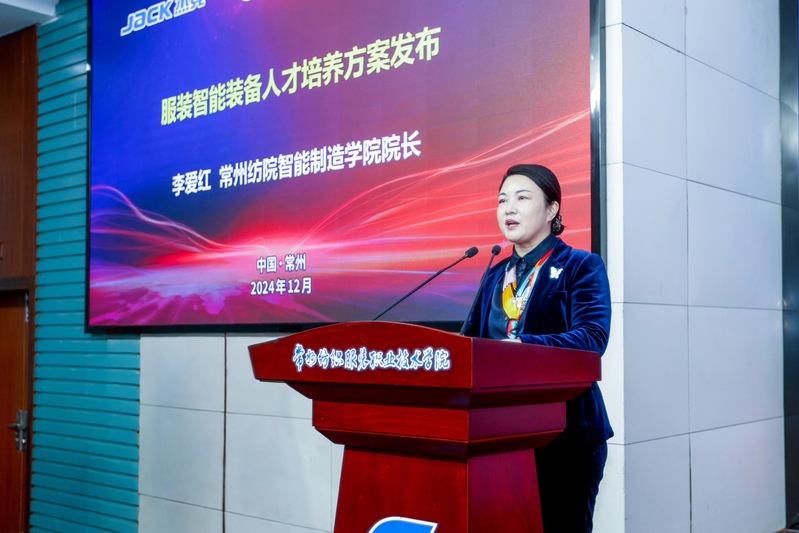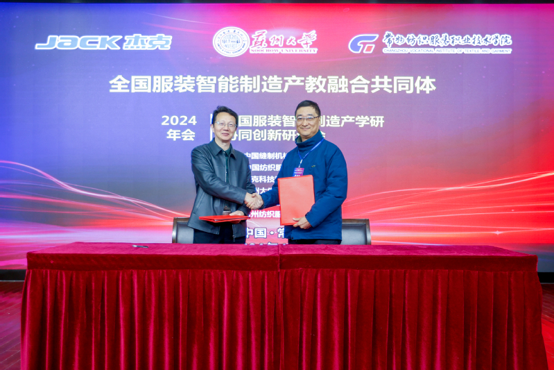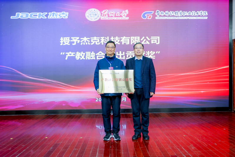 杰克科技股份有限公司总裁胡文海对共同体成立以来的工作进行了总结,并制定了下一年度工作计划。党委副书记、校长洪霄、杰克科技总裁胡文海分别代表双方签署了“校企协同创新合作协议”,通过共建服装智能制造技术创新与应用平台,进一步深化校企合作。常州市科教城管委会副主任庄三舵、常州华利达服装集团有限公司副书记钱震宏共同为“常州市纺织服装工匠学院”揭牌,希望通过共建工匠学院,培养更多具备工匠精神的纺织服装人才,推动纺织服装行业技术创新。为表彰杰克科技在产教融合领域做出杰出的贡献,校党委委员、副院长张文明代表我校授予杰克科技产教融合“突出贡献奖”。江苏省纺织工业协会副秘书长张彬发布了江苏省2025年《缝纫机械装配调试工》职业技能等级认定,这将为服装智能制造领域的人才培养标准和技能评价规范。我校智能制造学院院长李爱红发布了我校机电一体化技术(服装智能装备方向)人才培养方案。浙江赛唯数字能源总经理潘建国发布了服装智能制造企业人才与技术需求。