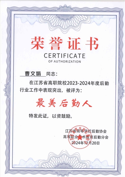 12月25日,高等职业技术教育后勤分会第二届第三次会员大会暨后勤论坛在扬州成功举办,我校被评为“2023-2024年度江苏省高职院校后勤行业先进单位”,曹文娟被评为“2023-2024年度最美后勤人”。