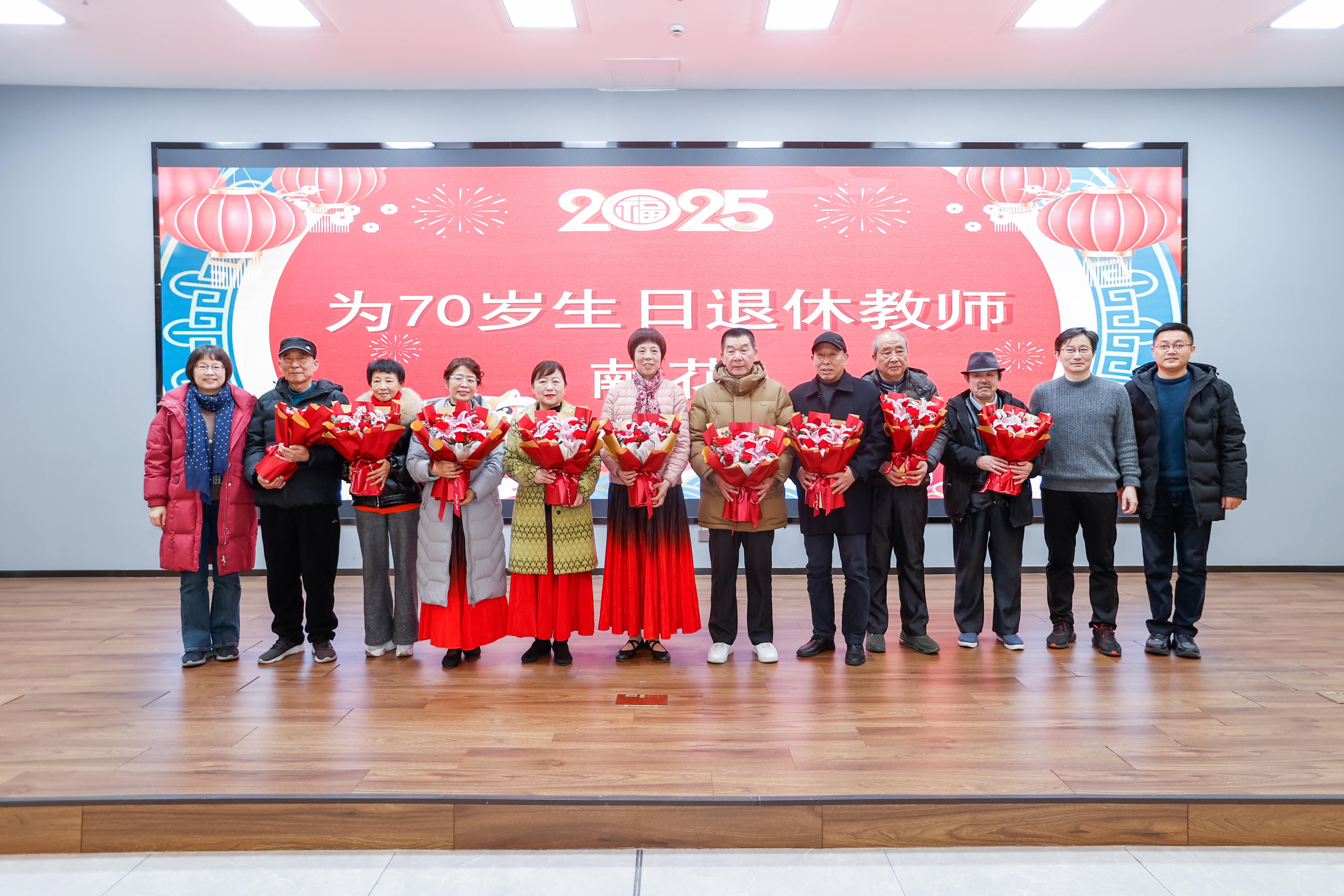 团拜会现场,高江荣、胡艳妹、顾广涛为今年9位七十岁的退休教师送上鲜花和生日祝福。退休教师代表、老校长金小坡代表退休教师发言,感谢学校对老同志的关心,老同志们将始终关心、支持学校的发展建设,期望退休老同志们能够发挥余热、老有所为,继续为学校建设贡献力量。祝贺学校一年来取得的成绩,祝福学校在党委的领导下一天更比一天好。