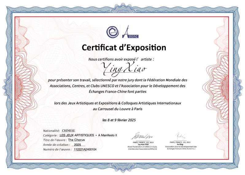 本次展览由联合国教科文组织协会世界联合会(WFUCA)、法中交流促进会(A.D.E.F.C.)联合主办。展览汇聚了来自中国、英国、美国等多个国家的艺术家,展出的作品来自英国皇家艺术学院、中央美术学院、中国美术学院、中国艺术研究院、伦敦大学、伦敦艺术学院、伦敦大学金史密斯学院、哈佛大学和麻省理工学院媒体实验室、美国哥伦比亚大学、美国波士顿大学、俄罗斯国立工艺美术学院、墨尔本大学、伯明翰城市大学等享有盛誉的高校和相关机构。法国艺术家协会主席雷米·艾融、法国著名插画家安德烈·德昂、法国艺术杂志Artension主编弗朗索瓦丝·莫宁等嘉宾担任展览艺术顾问。亚洲艺术研究院院长暨联合国教科文组织协会世界联合会法中交流促进会艺术项目发展官房婷婷作为策展人以其独到的艺术视角和国际视野,巧妙地将多元文化元素融入展览,彰显了亚洲艺术在全球舞台的独特魅力。