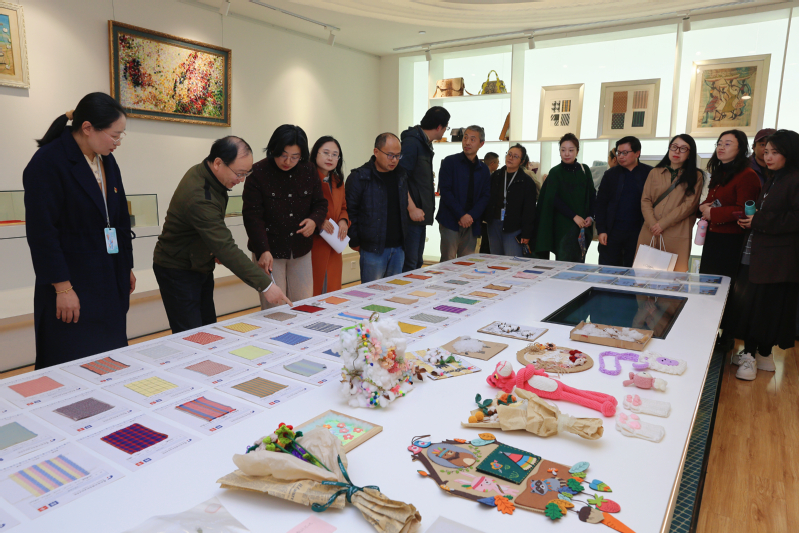 在智能纺织与材料学院周锁林老师的引导下,大家沉浸式体验了“纤维里的中国故事”:从战国时期的织机模型到现代智能纺织装备,从云锦织造技艺到航天服材料研发,一件件珍贵展品勾勒出纺织文明的发展脉络。在研学中,大家热烈探讨传统工艺的现代转化,观摩功能性面料实验室感受产学研协同创新,对“科技+文化+时尚”的学科交叉路径有了更直观认知。在现场,大家对用数字创意技术赋能纺织服装特色发展有了更多的想法,有的老师提出要用数字化技术让馆内珍贵展品“动”起来,有的老师三五成群开始讨论如何将馆内的各种面料和文创产品开发结合起来,有的老师则表示要把纺织文化科技馆中的思政元素融入专业课程的教学中。两位新进教师是首次踏进纺织文化科技馆,他们表示这次研学让自己直观感受到学校深厚的文化底蕴和纺织服装行业的科技含量,受益匪浅。