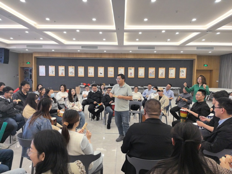 活动中,陈美宏解析了音乐疗愈的重要性,音乐,作为一种情感的载体,既是内心情感的表达途径,也是宣泄情绪的重要方式。随后,她通过节奏训练、乐器演奏融合多种艺术形式,带领参与者通过非洲鼓、手铃等简易乐器自由表达情绪,领秀展厅瞬间变身“声音实验室”。非洲鼓的低沉轰鸣、手铃的清脆叮铃、沙锤的沙沙细语,在陈老师的引导下渐次汇聚成富有层次的声浪。辅导员们尽情享受着律动的乐趣,充分感知音乐治疗的技术方法,领会在实际操作过程中的技术要点,沉浸式地感受音乐疗愈的独特魅力。