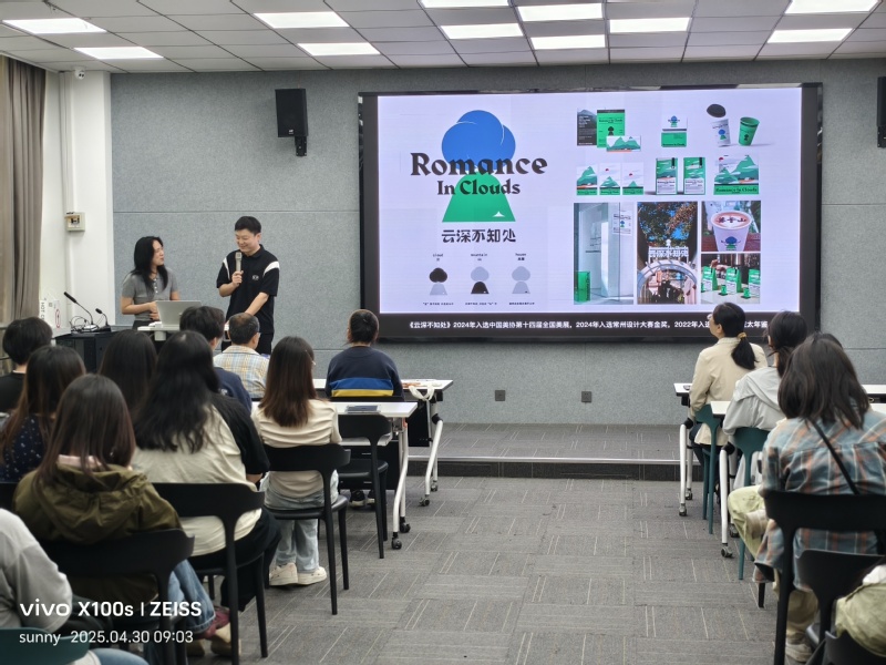 在课堂上,谈梦辰和卢丹以“于惊涛骇浪中扎实做自己”为主题,就公司的工作案例进行了深度分享。特别就作品《云深不知处》、《同人道》、《赛隆药业·熙悦玫瑰面膜》中品牌元素的提取、原创版画的绘制、品牌调性分析进行详尽的解读,为产品艺术设计专业2024级学生开拓了设计思维,提升了设计眼界。