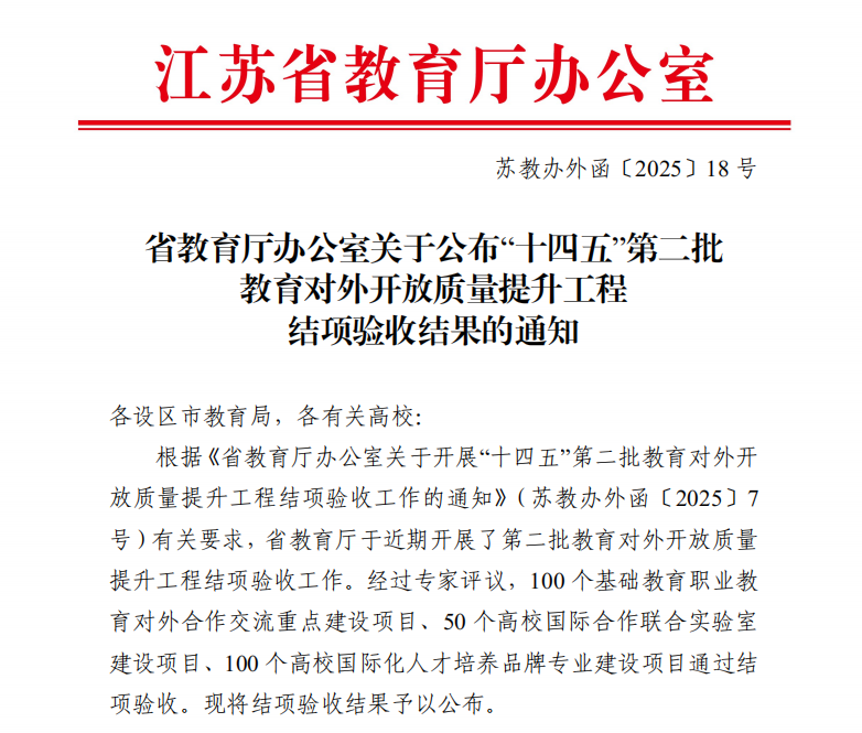 近日,江苏省教育厅公布“十四五”第二批教育对外开放质量提升工程项目验收结果,我校“服装与服饰设计第二批高校国际化人才培养品牌专业建设项目”圆满完成各项建设任务,顺利通过结项验收。